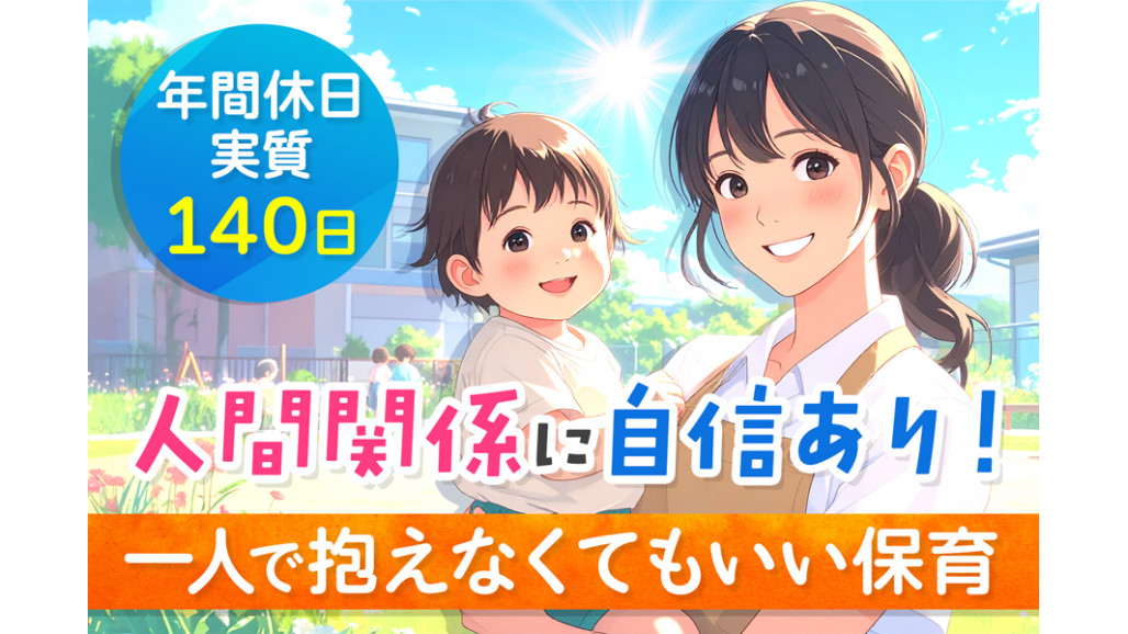 ✅このお仕事は保育士免許が必要です。 ⭐当園の特徴⭐ ✅残業ほぼ無し・持ち帰り仕事 ✅️年間休日(実質)140日! ✅️有休消化率100%! 【具体的なお仕事内容】 0~5歳児(定員60名)の保育園での保育業務です。 1クラス10~15名の体制で、子ども一人ひとりに丁寧に向き合えます。 ・一般保育業務 ・保護者の対応:夕方の受け入れと送り出し ・行事がある際の準備、実行 ・各書類作成 など =============== しっかり休める環境です =============== 当園では保育士が無理なく長く働けるよう、きちんと休める体制づくりを大切にしています。 完全週休2日制で年間休日は120日以上。さらに有給休暇の取得を積極的に推奨しており有休消化率は100%です。 誕生日休暇も含めると、実質年間休日は約140日になります。 ゆとりのある人員配置を徹底しているため、急なお休みにも柔軟に対応可能。お休みが取りづらい雰囲気はなく、プライベートの予定も大切にできます。 また、残業はほとんどなく、持ち帰り仕事もありません。 オンとオフのメリハリをつけながら、安心して働ける環境です。 【求人ID-HHS】 |