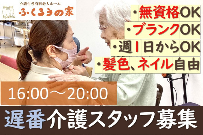 | 職種名 | 遅番の介護スタッフ 週1日から可 |