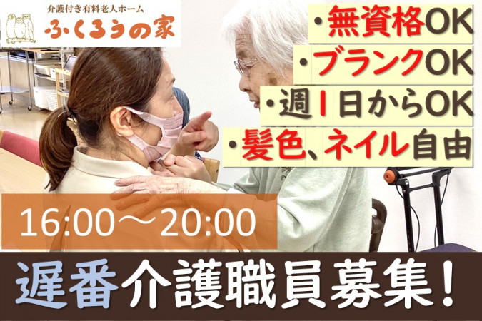 | 職種名 | 遅番勤務の介護職員 週1日から可 |