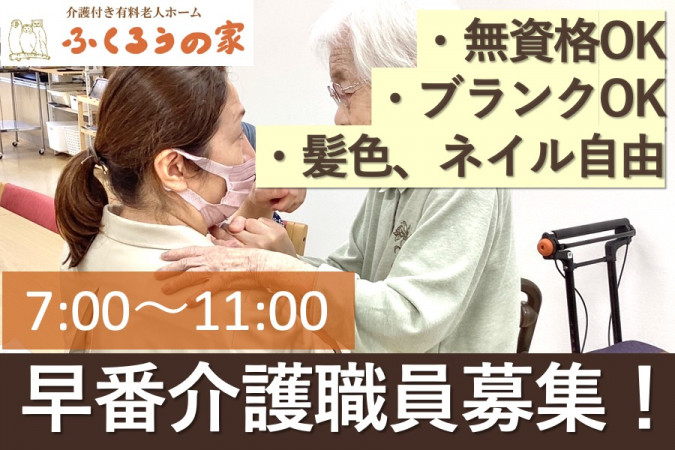| 職種名 | 早番の介護スタッフ 週1日から可 |