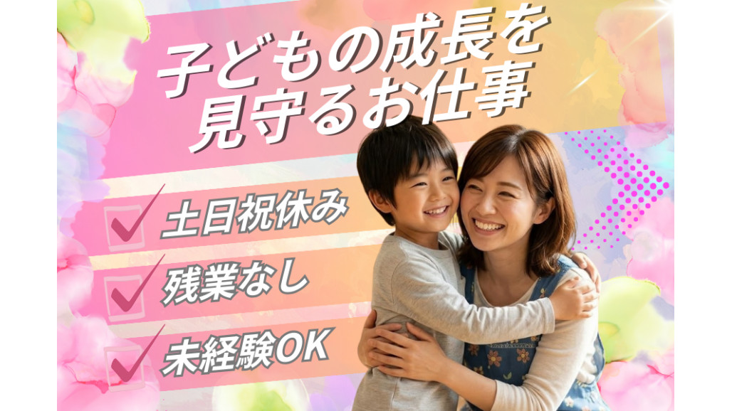 | 職種名 | 保育士 児発 放デイ施設勤務 1日4時間から マイカー通勤可 定時退社 有給完全消化 やりがい抜群 |