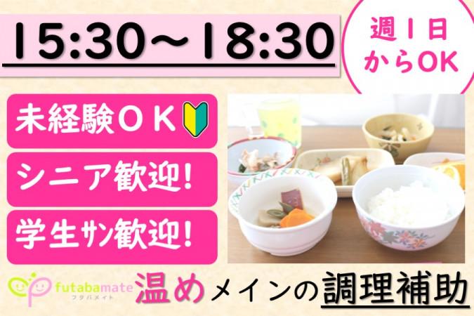 介護施設での「ご利用者様の食事の調理補助」のお仕事です! 料理・調理の経験や資格はいりません。 夕方からの時間を有効にアルバイトしませんか? 時間の前後の調整はご相談に応じます! 50代~70代の方、学生さん、主婦(夫)、Wワーク・トリプルワークさんにおススメです! ■お仕事内容 ・調理済みの料理(クックチル)の温め、盛り付け ・食器洗い ・数名分の食材の刻み(飲み込みやすくするため) ・一部簡単な調理(お味噌汁など) ※施設は有料老人ホームになります。 ※調理方法などは丁寧にお教えします。 ■ポイント 調理は、とっても簡単ですが、「すごく美味しい!」と評判のメニューです。上手に盛り付けていただければより一層喜ばれます! 「美味しかったよ」「ありがとね」と言っていただけるやりがいのあるお仕事です。 ■ご応募について いきなりの面接は不安な方や、まずは施設の様子をしりたい、お話を聞いてみたいという方のお問い合わせも大歓迎です。 まずは施設見学だけでもしてみませんか? もっと詳しく知りたい方は、「フタバメイト」で検索してください! |