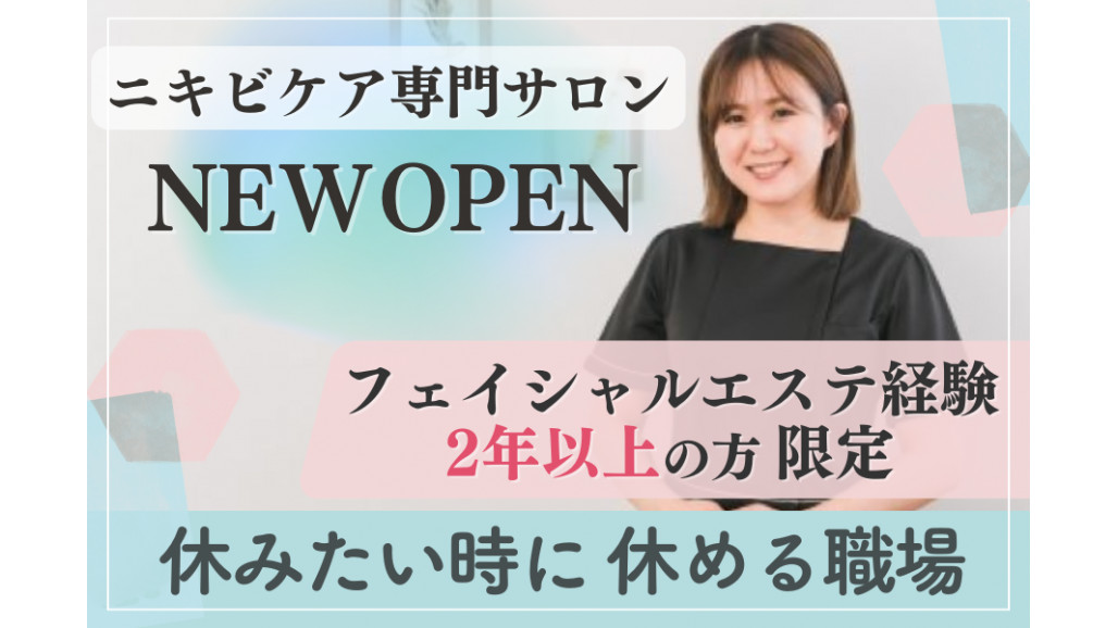 | 職種名 | ニキビ専門のエステティシャン・オープニングスタッフ 週休2日制 |
