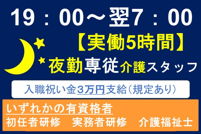 | 職種名 | 夜勤専従 週1日から可 実働5時間 |