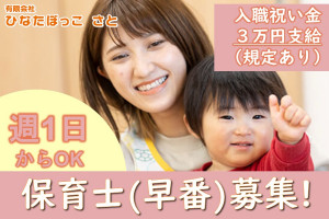 保育士の早番パートスタッフ募集!Wワークも大歓迎です!土曜日のみ、平日のみ…
