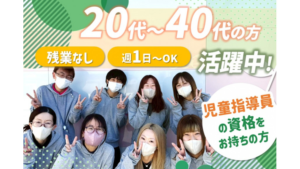 | 職種名 | 放課後等デイサービススタッフ 学童クラブ実務経験2年以上 完全週休2日 有給休暇の取得推奨 車通勤可 |