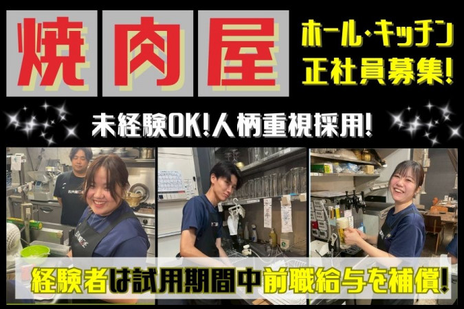 1982年創業、福山市に根ざし精肉・焼肉・卸・通販事業を展開。 地域密着の姿勢と独自性が評価され、地方創生メディア「Made In Local」広島を代表する企業100選に選出されています。 ⭐当店は創業40年以上の精肉店が手がける“品質にこだわった焼肉店”。 地域のお客様から長く愛され、業績も好調に伸び続けています。 さらに事業拡大に伴い、新店舗オープンも控えている今こそ成長のチャンス! 安定基盤のもとで、新しい挑戦を一緒に始めませんか? スタッフ同士の仲が良く、困ったときも助け合える温かい職場です! \ここで働くおススメポイント/ ■未経験からでも早期キャリアアップ可能! ■経験者は試用期間中、前職給与を保証! ■福山駅から徒歩1分&マイカー通勤OK ■U・Iターン歓迎!新生活を応援! 【具体的な業務内容】 ホール業務をお任せします。 ・お客様のご案内・接客 ・オーダー取り(ハンディ使用でラクラク) ・ドリンクや料理の提供 経験を積みながら、将来的には店舗運営やスタッフ育成など、店長・幹部候補として幅広く活躍していただけます。 =========== ✅スピーディーなキャリアアップ =========== まずは基礎を丁寧に学び、店舗運営の流れをしっかり習得していただきます。 その後は売上管理やスタッフ育成など、マネジメント業務にもチャレンジ可能です。 最短2年で店長に昇格した実績もあり、30代前半で店舗を任される社員も活躍中。 あなたの努力次第で、早期に経営に関わるキャリアを描けます。 =========== ✅プライベートも大切にできる働きやすさ =========== 週休2日制で、希望休や土日休みの相談も柔軟に対応。年間休日115日で、プライベートとの両立も安心です。 シフト希望も通りやすいため、「家庭や子育てと両立したい」「自分の時間を大切にしたい」といった方も無理なく働けます。 働きやすさを重視した環境で、長く安定して続けられる職場です。 =========== ✅充実の待遇・福利厚生 =========== 年2回の賞与(昨年実績3〜5ヶ月分)や永続勤務手当など、安定して働ける制度を完備。 さらに社員割引20%OFFで、家族や友人との食事もお得に楽しめます。 マイカー通勤も可能で駐車場無料。髪型・髪色・ネイルも自由なので、自分らしさを大切にしながら働けます。 経験者の方には、試用期間中(1ヶ月間)前職給与を保障。 期間終了後は面談の上で納得いただける給与を決定いたします。 あなたの経験やスキルを正当に評価し、安心して長く働ける環境をご用意しています。 【求人ID-SEI】 |