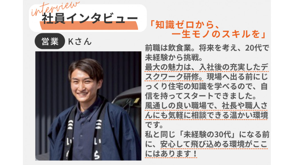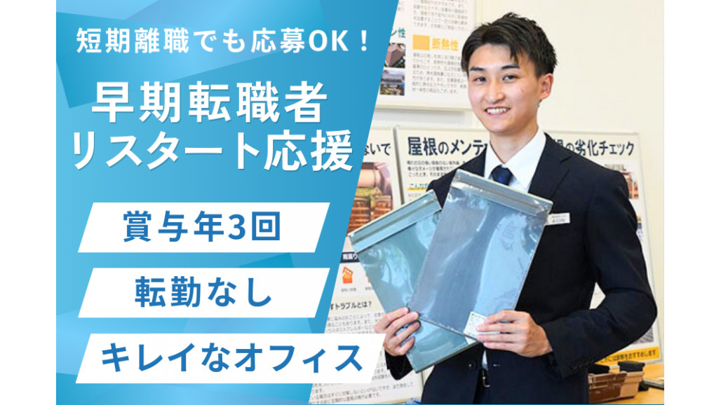 | 職種名 | 住宅リノベ会社の営業系総合職スタッフ・賞与年3回 転勤なし 第二新卒応援 |