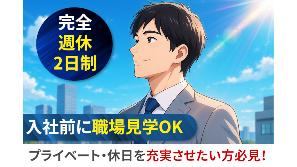 完全週休2日制 ・水曜日 ・日曜日 ・祝祭日 【長期連休休暇あり】 ・夏季休暇 ・年末年始休暇 ※年間休日105日 |