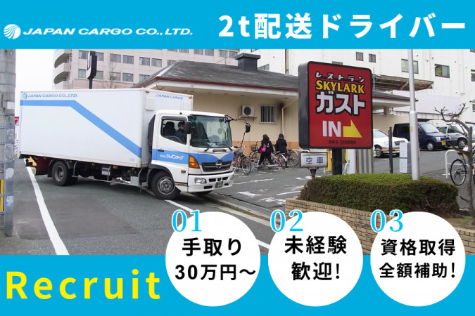 <2t食品配送ドライバー 募集> 中型トラックを運転して、すかいらーくグループの「ガスト」「バーミヤン」「しゃぶ葉」などのレストランへ食材を配送する仕事です。 決まったルートへの配送なので、ドライバー未経験でも安心して始めることができます。 安全運転かつマナーを守る運転技術が求められますが、あまり無理のないスケジュールになっているので、ドライバーの皆さんには焦らず丁寧にお願いしています。 こういった仕事は「力仕事」というイメージがあるかもしれませんが、キャスター付きのコンテナやカゴ台車を用意しており、女性ドライバーも活躍中です! 《具体的な業務内容》 ・店舗への配送 ・工場や外部倉庫から食材や原料などの輸送 ・その他付随する業務 など ーーーーーーーーーーーーーーーーー 【株式会社ジャパンカーゴの魅力ポイント】 ーーーーーーーーーーーーーーーーー ◆研修制度が充実!未経験でも安心して挑戦できます。 ◎免許取得支援やドライバー研修が充実しています! ◎大手グループだからこその福利厚生が充実! ◆従業員も家族も大切にする社風です! ◎従業員の皆さんが働きやすい環境を整えています。 ◎ご家族や大切な人があなたの仕事に誇りを持てることを目指します! ◆大手グループの安定基盤!生活リズムを崩さず働けます。 ◎生活リズムを崩さずプライベートも大切にできる働き方が可能! ◎景気に左右されにくく腰を据えて働けます。ライフプランも描きやすい! 【株式会社ジャパンカーゴについて】 株式会社ジャパンカーゴは、すかいらーくグループの一員として物流を担う企業です。 レストランへの配送や、工場・倉庫への食材・原料輸送を担うことでお客様の”美味しい笑顔”を支えています。 《あなたの運転が笑顔を支えます》 私たちは、従業員一人ひとりが「弊社の顔」だと考えています。だからこそ、「安心・安全・確実な配送」を徹底し、それぞれのドライバーが自信と誇りを持って働ける環境づくりに全力で取り組んでいます。 そして、私たちは働くあなたが前向きになれるよう、家族や仲間など”あなたの周囲にいる人たちも応援したくなるような会社”を目指して、日々努力を続けています。 そんな私たちと一緒に働きませんか?皆様のご応募をお待ちしています。 【このような方のご応募をお待ちしております!】 ・未経験から新しい仕事に挑戦したい方 ・運転が好きな方 ・体を動かして働くことが好きな方 ・誰かの役に立ちたい気持ちがある方 ・一人で真面目にコツコツ働くのが好きな方 ・安定した環境で長く働きたい方 ・プライベートの時間を大切にしたい方 など 職場のリアルを覗いてみませんか? 採用情報だけでは伝わらない社員の日常や社内イベントの様子を、公式SNSで日々更新中! ぜひフォローして、当社の雰囲気を体感してください。 ★YouTube:@japancargo ★Instagram:@escommerce ★TikTok:@japancargo_saiyo |