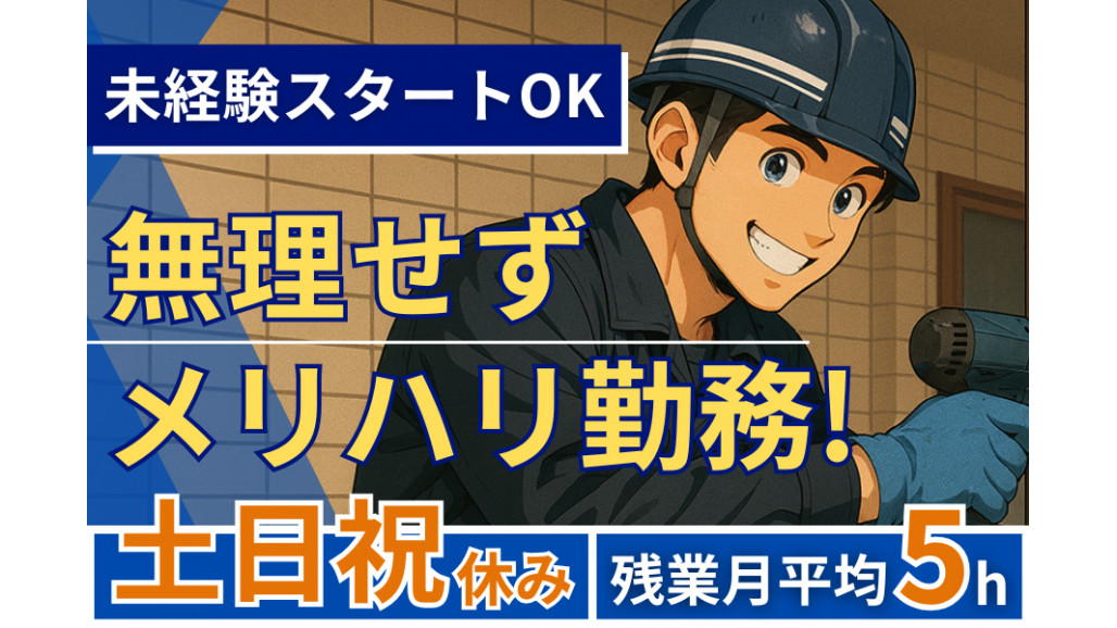 | 職種名 | 集合住宅設備のリフォームスタッフ 完全週休2日制・土日祝休み |