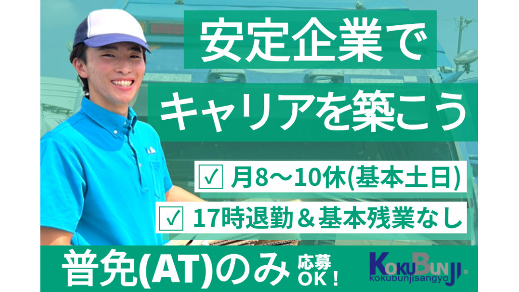 \こんな職場をお探しの方!/ ごみ収集員兼ドライバー(正社員)で働きませんか? =============== ★月休み8~10日(基本土日) ★定時は17時、基本残業なし ★普通免許(AT)だけで応募可能◎ =============== 《仕事内容》 ・ごみ収集車の運転 ・ごみ回収(家庭ごみ/飲食店や企業様の事業ごみ等) ▷二人一組で決まったルートを巡回※業務により変動あり ▷エリア:下野市のごみステーション等 ▶ごみ収集員が未経験でも大丈夫◎ 先輩に同行し、業務の流れを覚えるところからスタート 普通免許(AT)さえ持っていればOK♪ ※中型免許は入社後取得(費用はすべて会社負担) 一生モノのスキルとして将来のキャリアにも活かせます! ──────────────────── \ごみ収集員兼ドライバーの魅力POINT/ ──────────────────── ★プライベートと両立できる 基本土日休み:ご家族や友人とも予定が合わせやすい◎ 17時退勤&基本残業なし:自分の時間を確保できます! ──────────────────── ★充実の研修制度 OJT研修~AI/マネジメント等のスキルアップ系まで ご自身のキャリアプランに合わせて受けられます ──────────────────── ★社内ジムを自由に利用OK 勤務後にそのままトレーニング可能で、 ジム代は一切不要◎健康維持や気分転換にもピッタリ ──────────────────── ★徹底した安全管理 全車両ドラレコ搭載で運転中も安心♪ 定期的な安全講習でフォロー体制バッチリ ──────────────────── ★社内イベント活発 社員旅行/懇親会/中期総会/BBQなど メンバー同士の交流も大切にしています! ──────────────────── 《キャリアアップイメージ》※例 1年目:現場研修・初任者講習修了後、運転手業務(年収320万~) 3年目:現場リーダー(年収380万~) 5年目:課長クラス(年収450万~) ▷お給料は毎年3千円アップ保証&役職手当7.5万~36万円 着実にステップアップしながら収入を伸ばせます◎ 《職場環境》 ★20代・30代の若手活躍中! 面倒見の良い先輩ばかりで、自然と声をかけ合う温かい雰囲気 仕事中は真剣に、休みには一緒に食事やゴルフを楽しむなど、 on/offメリハリ持って働いています 先輩・後輩も気さくに話せるような関係性です♪ 《国分寺産業について》 1964年の創業から、人々の暮らしを支えるための活動を続けています! 廃棄物回収・清掃汲取・アメニティ・飲食など、他業種にわたる事業を展開 小学校との交流や行事への参加など、地元の方々とのつながりを大切にし、 「地域になくてはならない企業」を目指して奮闘しています! 一緒に安心・快適なまちづくりを通して地元に貢献しませんか? まずは話だけ聞いてみたい...など 弊社のごみ収集員兼ドライバーに少しでも興味のある方、ぜひ一度ご応募ください! ▶Web面談/一日体験OK ▶Instagram(kokubunji.sangyo) |