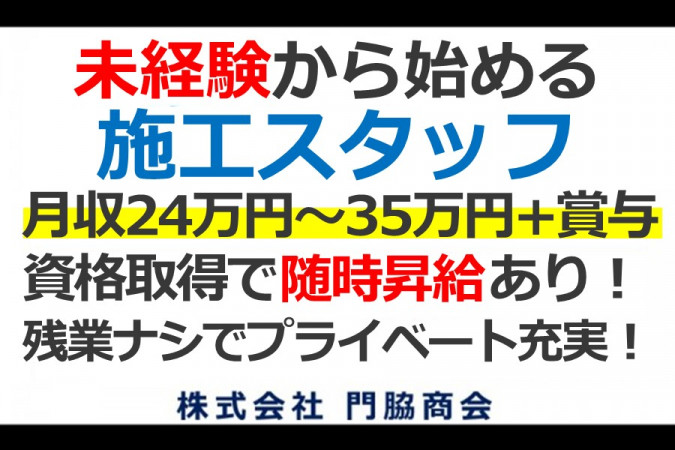 未経験からでもすぐに仕事を覚えられるよう研修制度や資格の取得制度を充実させてきた当社。新たに活躍して頂く施工スタッフを募集致します。 さまざまな事業を展開しているため、1年を通して仕事量が安定しています! 【PRポイント/門脇商会の自慢】 ・現場未経験の方も積極的に採用中 ・資格取得などで随時昇給あり! ・何より人を大事にする優しい企業です ■具体的なお仕事内容 耐震補強などを目的に、壁や床にドリルで穴をあけて鉄棒を打ち込む「アンカー工事」や、雨漏りから建物を守るための「防水工事」をお任せします。 ・ドリルを使っての手元作業 ・道具や資材の積込みや片付け ・現場監督からの作業指示の確認 など、まずは簡単な作業からスタート! 工事自体は複雑な作業ではない為、2週間~1ヶ月で覚えられるので安心です。 【エリア】 ・名古屋市内 ・刈谷市 ・大府市 ・豊田市など 会社から約30分~45分の現場がメインです! 作業は最初は2名体制で向かい、仕事に慣れてきたタイミングで一人で現場に向かいます。 【現場】 ・オフィスビルやマンション ・学校や病院、戸建住宅など ================= 快適な職場環境 ================= ・残業はほとんどナシ ・長期休暇や育児休暇も充実! ・昇給や賞与など福利厚生も充実 ■何より人間関係が良いのが特徴です! 一度会社に来て頂ければ分かる『面倒見の良さ』『サポート』はどこよりも負けません! 「見て覚える」職場ではありません。一緒に仕事しながら、きちんと言葉で教えていきます。 ▽日々の仕事を見て、「この工具を使うと良いよ」「この工事はこうやるんだ」といった具合に、具体的な評価を行います。 できなかったところは次にできるように、良いところは褒めるといった、フィードバックを通して成長を目指します。分かるまで何回でも教えますし、何回でも聞いて下さい。 |