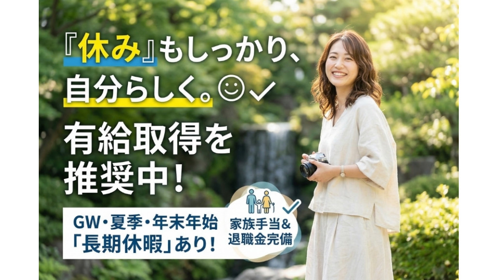 週休2日制(土日祝) ※土曜日は隔週にてお休みとなります。 ■年間休日110日 【長期休暇あり】 ・GW休暇 ・夏季休暇 ・年末年始 【有給休暇あり】 仕事も大事、休むことも同じくらい大事。その考えのもと、気兼ねなく有給を使える環境づくりを進めています。 |
