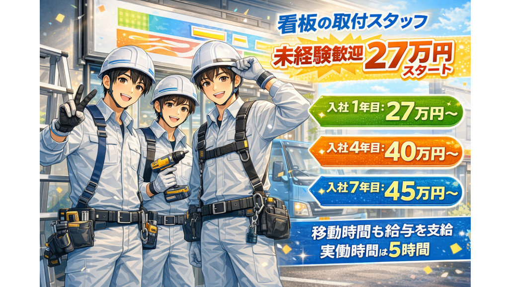 | 職種名 | 看板を取り付ける作業スタッフ 未経験を採用中 週休2日制 移動中も仕事時間 実働5時間の勤務 |