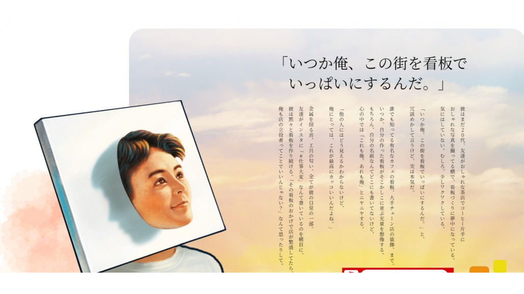 MESSAGE 代表メッセージ 看板づくりを全国へ広める挑戦 駅前ビルに掲げられた看板、街中のCaféの看板、目的地を表示している看板・・・などなど街の中から一切の看板がなくなった風景を想像してみてください。色の無い無機質な街が頭の中に浮かびませんか? 看板とは街の彩りを創出したり、お店の繁盛のお手伝いをしたり、街行く人をスムーズに目的地に案内した り、たくさんの人のお役にたっているんだなと実感します。私たちクレイン工芸社はそんな看板をつくってい る会社になります。 私は19歳の時、先代の社長が倒れたのを機にクレイン工芸社に入社し、看板職人として働き始めました。 徐々に仕事を覚えていく中で、一つ一つのサイズ、形状、デザインの違う看板をつくるワクワク感、毎日違う 現場に行く楽しさ、看板を設置し終えた時の達成感、夏の現場が終わって家で飲むキンキンに冷えたビールの 旨さなどの経験を積み、気持ちが満たされていくと同時にだんだんと看板職人という仕事に魅せられていきま した。 10年間職人として働き、もっと多くの人にこの仕事の魅力を伝えたいと考え、営業・経営へと進みました。鉄 や木、LEDなど多様な素材を扱い、自らの手で設置する楽しさは他にはない魅力にあふれています。街を歩けば、自分たちがつくった看板が目に入り、その看板を見ている方を肌で感じた時、私たちは少しでも役になっ ているんだなぁと誇りを感じる瞬間もあります。社員の中には「これ、パパが作った看板だよ」と子どもに誇ら しげに話す人もいるほどです。 現在、私たちは東海エリアから関東・北陸へと事業を拡大し、さらに全国展開を目指しています。ぜひ、私た ちと一緒に街を彩る看板づくりに挑戦しませんか? 代表取締役 山下寛高 |