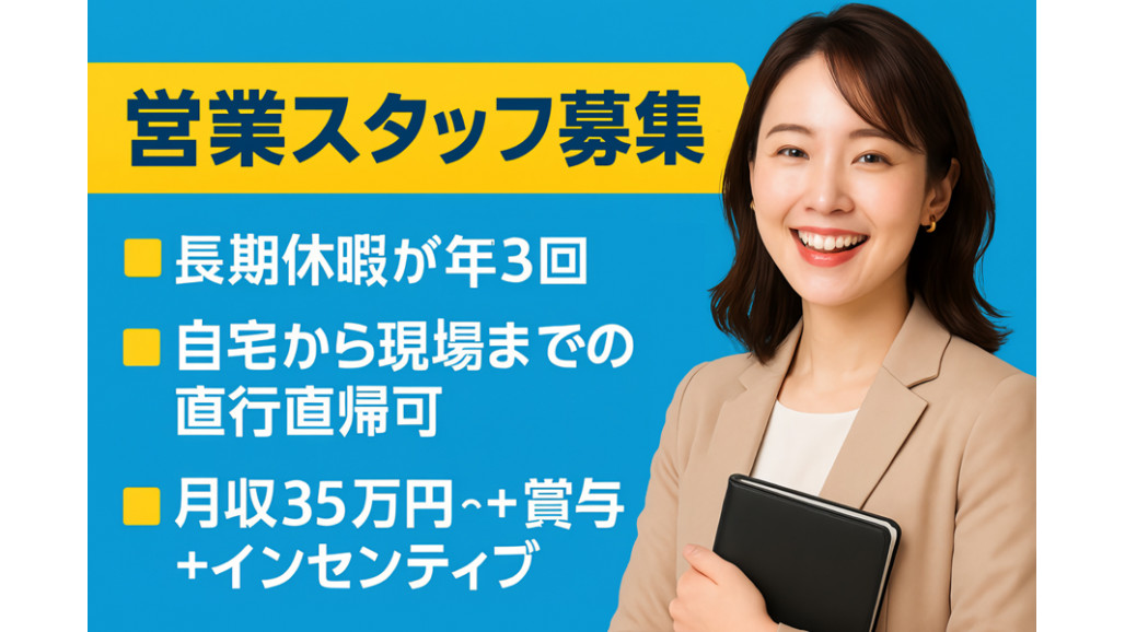 【業界未経験でも積極採用中!】 人と話すことが好き。デザインを学んだことがある。――その経験を街の景観づくりに活かしませんか? ■必須条件 ・高校卒業以上 ・法人営業、または新規営業のご経験 ・普通自動車運転免許(AT限定可) ・PC操作(Word、Excel、メール等) ・定年60歳のため、60歳未満の方 ■優遇条件 ・広告やデザインに関心がある方 ・デザイン等を学校で学んだ経験がある方 ・広告代理店や看板(サイン)業界経験 【ご応募お待ちしています!】 銀行員から転身してデザインの専門学校で学び、その後営業職に挑戦した先輩も活躍中。「営業力」と「デザインの下地」、その両方を街の景観づくりに活かせるのが当社の営業です。 月給35万円スタート+成果に応じたインセンティブで、あなたのキャリアを正当に評価します! |