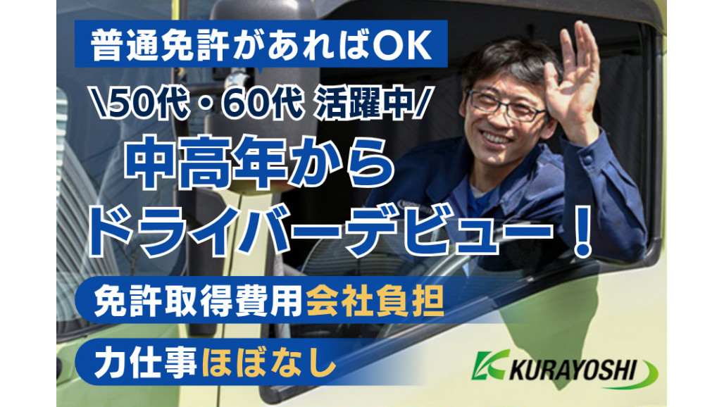 物流企業で4tドライバーを正社員募集! 普通自動車免許(AT限定可)をお持ちであれば始められます◎ 【こんな方にオススメ】 ・50代未経験から始められる仕事を探している ・運転が好きで、気疲れしない環境で働きたい 【この求人の魅力】 ◆決まった場所へのルート配送なので、道順固定で迷わない! ◆商品は台車を利用し降ろすだけで、体への負担少なめ! ◆会社全額負担で中型免許が取得できスキルUP! ◆ドラレコやデジタコ搭載/携帯貸与で即時連絡可能の安心体制! ◆深夜勤務なし&連休や希望休に柔軟対応! 【4tドライバ―仕事内容】 ホームセンター店舗間の配送ドライバー業務をお願いします ・使用車両:4tウイング車 ・川崎東扇島にて積込→神奈川/東京/千葉/茨城エリアへ ・件数:1日2~3回往復配送 ◆再配達やワレモノなし ◆配送先では荷台から台車で荷物を降ろすと、運び込みは店舗スタッフが対応 【研修】 ①先輩ドライバーから荷物の持ち方のコツや納品の手順などイチからレクチャー ②慣れてきたら運転へ。「運転しやすい道だけ」など段階的に慣れていきます ③月1回の勉強会「事故ゼロ運動」で安全への意識を高めます 【職場環境】 平均年齢55歳で、中高年が多数活躍中! チーム制(リーダー+メンバー数名)で、皆さん穏やかなので、何でも気軽に相談できます 離職率5%と非常に高い定着率が自慢です 【株式会社倉吉運輸について】 郵便配送も任される社会的信頼のある総合物流企業です 安全装置を導入し、トラブル対策やデータ活用による運転技術向上で事故を未然に防止 鍵忘れアラートが鳴る仕組み化づくりなど、ヒューマンエラーも効率的に回避 社員が安心して働ける職場づくりに取り組んでいます ~倉吉運輸公式SNSで情報発信スタート~ Instagram: kurayoshiunyu_official TikTok: kurayoshiunyu_official ぜひSNSをチェックして、最新情報をお見逃しなく! 当社の4tドライバーへご興味をお持ちの方は、ぜひ一度ご応募ください! ◆ご希望の方は1日体験OK(時給1,225円) |