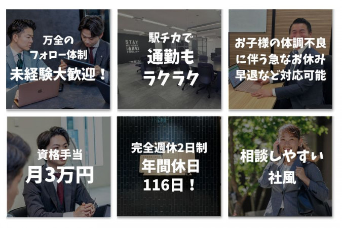 ■応募資格 ・普通自動車運転免許(AT限定可)をお持ちの方 【ご入社にあたって】 入社時に「有効な宅地建物取引士証」のご提出が必要となります。 ※宅地建物取引士証をお持ちでない場合は、交付申請等の手続きを行っていただき、受領後のご入社となります。 なお、入社後は専任の宅地建物取引士として登録をお願いする可能性があります。 ■定年60歳。再雇用制度あり(最長65歳まで) ※再雇用後の雇用条件(給与など)は、スキルや能力に応じて決定いたします。 【宅建資格をお持ちの方!】 「資格はあるけど実務経験がない」方も大丈夫! 当社では長期的なキャリア形成を目指し、幅広い世代の方を積極採用中です! ■20〜50代まで活躍中! ■男女ともにバリバリ活躍中! ■業界・職種未経験の方もOK! |