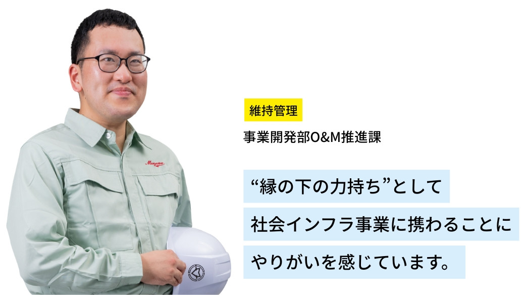 受託している地方自治体の下水処理場や農業集落排水施設の運用代行業務を行っています。業務の内容は主に点検、検査、水質改善や設備改善の施策考案など。ルーティンとして決まっている業務も多いため、プライベートと勤務のメリハリをつけやすいのが特徴です。実際の施設運用が仕事であるため、天候による水質の急激な変化への対応など、責任感のある対応が求められます。