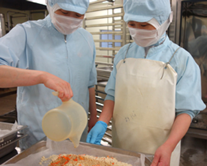 互いに支え合える企業を目指して 主な事業は、学校給食と介護施設・在宅向け配送サービス、自社ブランド品の開発です。学校給食は通常、メーカーで生産したものを栄養士が選びます。しかし、マルヒ食品には自社工場があるため、味やバランスといった栄養士の細かいニーズに対応できます。「子どもたちにとって、食べることは味を楽しむ、食文化を学ぶ、性格や感情を作るために大切な習慣です。そのお手伝いをしたいのです」と社長は強い意気込みを語ります。介護施設や在宅向けの配送では、高齢者が何歳になっても食べる喜びを味わえる献立に仕上がっています。簡単に、3食飽きずに食べることができる工夫も大切です。飲み込みが難しい人には、ムース食も提供しています。たとえムース食でも、一つひとつ味の付いた、形のあるもの食べて欲しいそうです。作った食品はすべて、作った時においしいのではなく、食べる時においしいと言ってもらえるように日々努力しているのです。
