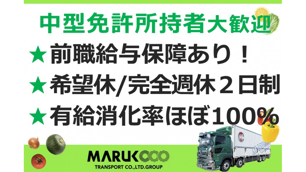 | 職種名 | 中型ドライバー 青果の配送業務 希望日のお休みも可 有給休暇取得推進企業 社員寮あり |