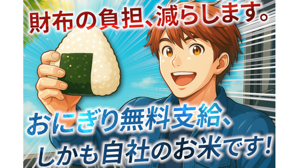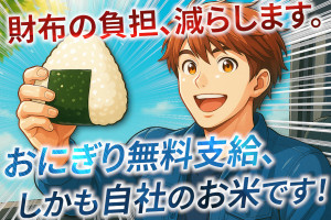 ・昇給あり(毎年昇給) ・退職金あり ・交通費支給 ・社員寮も相談可 ・特別手当 ・品質手当 ・残業手当 ・時間外手当 ・休日シフトの相談可 ・24時間利用可能な社員専用ジムあり 【有給休暇は積極的にご活用ください】 ファミリータイム、プライベートタイムを大切にしており、有給休暇の消化率はほぼ100%です。 ぜひ有給休暇を使って家族や友人との時間を大切にしてくださいね! 【自家製のお米で毎日手作りおにぎりを提供!】 出勤前や帰社時に好きなだけ持ち帰れます。自社で育てたお米を使い、社員を応援します! 【ガソリン代ゼロ!いつでも自由に給油OK!】 ガソリン代は全額会社負担!指定のガソリンスタンドで、いつでも無料で給油できます。安心して仕事に集中できる環境を整えています! |