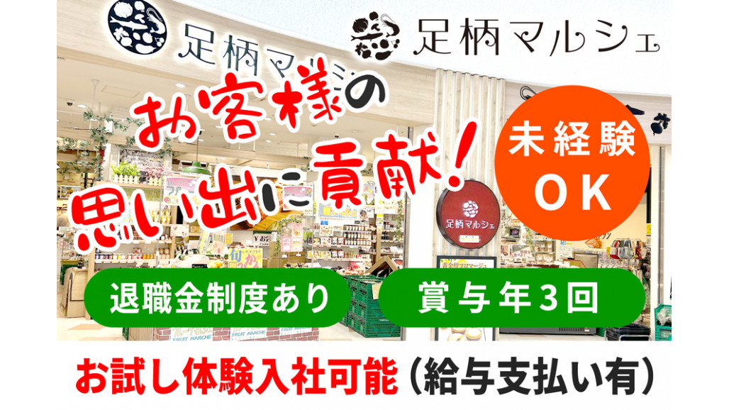 足柄サービスエリア内の「足柄マルシェ」での店舗スタッフを募集! お客様の旅路に彩りを添え、思い出作りに貢献できるお仕事です。 多くの特産品を扱うショップなので、地域の活性化にもつながります! ✨オススメポイント✨ ■安定の正社員雇用! ■未経験・ブランクOK! ■転勤なし!腰を据えて長く働けます! ■賞与年3回!頑張りをしっかり評価! 【 お仕事内容 】 足柄サービスエリア内のお土産屋「足柄マルシェ」での店舗業務全般をお願いいたします。 ・商品受け入れ、品出し ・接客及び販売(土産品等) ・レジ操作、金銭管理 ・店舗内販促品作成 ・テイクアウト品の調理 ・配膳、青果袋詰め など =============== こんな方にオススメ! =============== ✅静岡が好き!御殿場の名産を全国に向けて発信したい!という地元愛溢れた方 ✅自分の存在を必要とされる場を探している方 ✅飲食や販売など、何かしらの接客のお仕事の経験のある方(ブランクがあってもOK) ✅人が好き、コミュニケーションが苦にならない方 ===================== 未経験から夢を叶えるチャンス! ===================== 「地元の名産品の販売を通して、街を元気にしたい」 「コミュニケーション能力を活かして働きたい」 そんな夢を本気で実現させてみませんか! 接客や販売の経験がない方やブランクがある方でも大丈夫。丁寧な指導や各種研修であなたの成長を全力でサポートします。 会話が好き、笑顔が好きなあなたの個性を発揮しながら、キャリアパスを実現させる第一歩として、ぜひチャレンジしてみませんか! ======================= マツザワホールディングスについて ======================= 足柄マルシェの運営を行っている当社は、北海道から沖縄まで全国展開する観光土産品の企画と卸売りをする企業グループです。 お土産の販売や卸事業だけではなく、自社で地元の農家とタイアップしてお土産品の企画・開発なども手掛けています。 長野の銘菓「りんご乙女」も、廃棄されていた摘果のリンゴを有効活用する事もひとつの目的として生まれた当社の自慢の商品です。 お土産品を通して、地域の活性化に貢献する当社で、大きなやりがいを感じながら働きませんか。 マルシェの販売スタッフは、直接お客様のお声や感想を集約する窓口として重要な役割です。 =============================== 社員の「スキル」や「取り組む姿勢」も評価する社風 =============================== 当社には【ピアボーナス制度】というインセンティブ制度があります。 4半期ごとに全社員投票を行い、得票数に応じてインセンティブ(2票集めると5000円)が支給されます。 一度きりではなく、何回でも内容を変えて受賞できます。 過去の受賞例(挨拶、笑顔、声掛け、陳列、レジ対応、中国語、英語、商品選定など) スタッフの得意な分野やスキル、取り組みの姿勢、プロセスなどを仲間同士で認め合える社風が自慢です! 【求人ID-TNC】 |