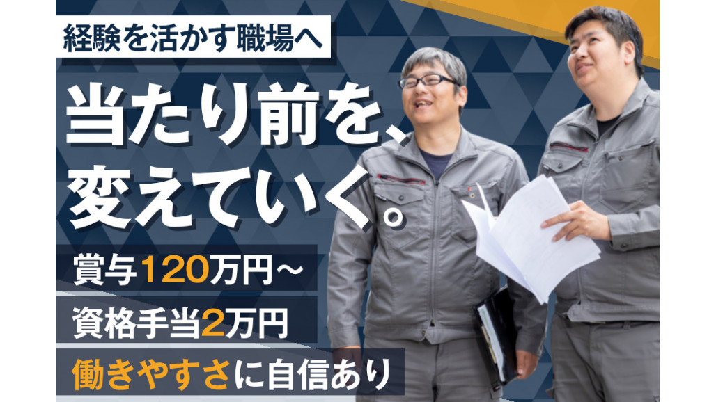 | 職種名 | 建設基礎工事の施工管理 賞与年3回・昇給随時・ほぼ残業なし・直行直帰OK |