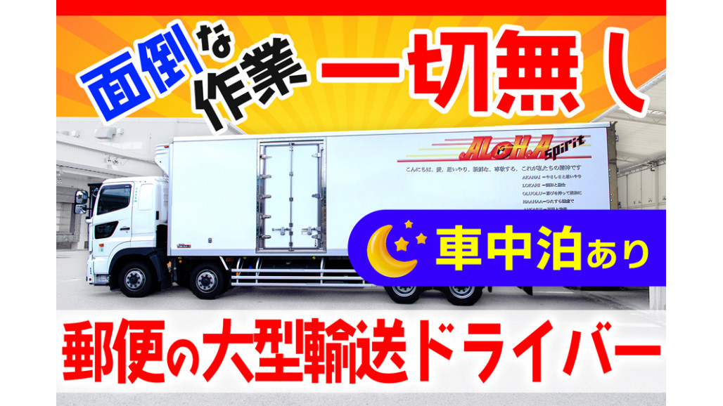 東海3県や関東方面等へ配送をお任せします。 配送するものは郵便物のみです。 ※月に5~7回程、宿泊を伴う関東方面への輸送業務もお願いしています。 ▶地場配送の場合 ・愛知県内の郵便物が集まる支局へ移動 ・カゴ台車ごとトラックに乗せる ・各郵便局まで配送 ▶関東方面への配送の場合 ・15時頃営業所を出発し愛知県にて荷物を積み ・その日の深夜~明け方に関東の配送先に到着 ・車中泊し、その日の夕方に関東で積み込み ・営業所に向け出発し深夜~明け方に到着  ̄ ̄ ̄ ̄ ̄ ̄ ̄ ̄ ̄ ̄ ̄ ̄ ̄ ̄ ̄ ̄ ̄ ̄ ⭕月給42万円も可能! 大手物流会社で安定したお仕事を スタートいただけるチャンスです。  ̄ ̄ ̄ ̄ ̄ ̄ ̄ ̄ ̄ ̄ ̄ ̄ ̄ ̄ ̄ ̄ ̄ ̄ しっかりと休んでいただき、無理のないスケジュールだから安心・安全に働けますよ! 勤務いただくのは交通量の少ない時間帯なので渋滞のストレスもありません。 ===================== 地場配送を経て大型中距離配送に成長! 順を追って覚えやすい&負担が少ないお仕事。 ===================== 複雑な工程は一切なく、ムリなく続けられる環境。まずは地場配送で郵便物配送を覚えていただき、大型での関東への輸送をお願いします。 大型ドライバー未経験や経験の浅い方でも、丁寧な研修で基礎知識から運転技術、配送の流れまでしっかり習得できるので安心してスタートできます。 \固定ルート/ 「大型ドライバーとして活躍したい!」 「大きなトラックの運転手に憧れていた!」 「実務経験を積めるなら挑戦してみたい! という方にもピッタリです。 ===================== 独り立ちの前に行う【ドライバー研修】あり /専門部署による研修でプロへの第一歩を!\ ===================== ▶経験に応じて研修を行います。座学や同乗など基礎から確認、運転技術を磨き上げます。 ⭕座学での知識再確認で不安を排除 ⭕トラックドライバーとしての注意点 ⭕納品の際のお客様とのやり取りの確認 など ※商品破損、事故は会社が完全補償する制度もございます。 あなたが一人前のドライバーとしてお仕事ができるようしっかりとサポートいたします! ▶▶だから! 未経験や異業種からの転職者に多数ご活躍いただいています! 年齢は幅広く30代、40代の方を中心に、50代の方の入社実績もあります! ご家族のため、将来のために前向きな転職を検討されている方や、ブランクのある方もぜひご連絡くださいね。 ===================== 新しいことに挑戦したいけど、 まずは安定が大事とお考えの方にもオススメ! ===================== 挑戦も安定も手に入れるチャンスです。 お持ちの大型免許、持っているだけではもったいない!需要の多いそのスキルを当社でぜひ活かしてください。 経験は入社後から積んで、成長していけるので安心して大丈夫ですよ。ここから大型ドライバーに挑戦しましょう! 安定した環境のもとでスキルアップやキャリアアップを目指せる、将来につながる働き方がここにあります。 ▶ご応募お待ちしています! 【求人ID-MH01】 |
