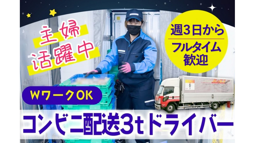 | 職種名 | コンビニへの常温帯商品配送ドライバー 週3日~5日 選べる勤務時間 3トンMTトラック /jop3 |