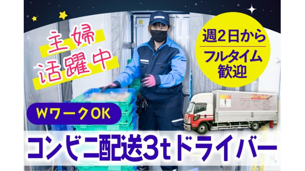 | 職種名 | コンビニ向け常温商品の配送ドライバー 3トンMTトラック 普通免許で応募可 家庭と両立 /jop3 |