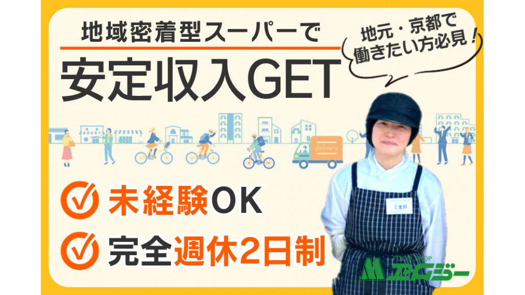 スーパーマーケットのレジ・品出しスタッフを正社員募集! エムジー上堀川店でスーパースタッフの業務をお願いします ・商品の補充や陳列などの品出し ・レジ対応 ・商品の発注などの在庫管理 |具体的には… メインは以下商品の補充・陳列です ・ドライ商品(乾物・調味料・飲料・菓子など) ・日配(乳製品・納豆・豆腐・生麺など) ゆくゆくは商品の配置をご自身で決めていただきます 商品の魅力がよりお客様に伝わるような売り場づくりや接客の楽しさあり♪ |スーパースタッフが未経験でも大丈夫! 入社後はカンタンな品出しから始めていきます 少しずつ商品の特徴や配置を覚えていきましょう! レジ業務は商品バーコードをピッと読み取るだけ! あとはマニュアル通りに画面上のボタンを操作すればOKです \\おすすめポイント// ──────────────── ◆プライベートも大切にできる環境 ──────────────── 完全週休2日制 ──────────────── ◆頑張りはしっかり還元 ──────────────── 賞与あり(年2回) 私たちと一緒にご自身の価値を最大限に発揮しませんか? ──────────────── ◆エムジーならではの福利厚生 ──────────────── 嬉しい食料品の社割あり 野球好き必見!プロ野球観戦チケットも配布しています♪ ──────────────── 【エムジーについて】 「食の都 京都」で台所を支えて50年の地域密着型食品スーパーです 確かな実績と信頼のもと、京都市内に7店舗を展開中! 百貨店と同じような高品質な惣菜をお手頃な価格で提供しています 地元で末永く働いていきたい方にはピッタリの職場です◎ 需要拡大に伴い、店舗での調理スタッフを増員募集! 【職場環境について】 現在、20代/30代のスーパースタッフが活躍中! 業務の効率化などの働きやすい環境づくりを実施! 育児や介護を行いやすい短時間勤務も導入しておりライフスタイルが変わっても安心です グループ交流会や忘年会などの社内イベントを定期的に開催◎ 髪型・髪色自由でオシャレを楽しみながら輝けます♪ 流通/小売り業に興味がある方、 スーパースタッフとしてお気軽にご応募ください! ▶一日体験も受付中 ▶学歴不問!高卒の方も応募OK |