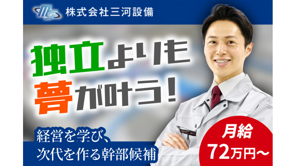地域に安心と快適を届けてきた私たちは、新たな挑戦として上場を見据えた経営改革を進めています。 このたび募集するのは、そんな変革の中心で活躍していただく幹部候補です。これまでの経験を活かし、企業の成長戦略に直結するダイナミックな仕事に挑戦してみませんか。 現場マネジメントにとどまらず、経営戦略の立案や営業エリアの拡大にも関われる将来性に満ちたポジションです。 当社は東海エリアでトップクラスの企業を目指しており、給与水準においてもトップクラスを実現しています。年収1,500万円の採用実績もあり、経験や成果に応じて収入を伸ばせる環境です。 【おすすめポイント】 ・上場準備に直接ジョインできるポジション ・幹部候補として経営層と連携し戦略立案に参画 ・新設ポジションならではの裁量の大きさ ・マーケット拡大の仕組みづくりにも関与可能 ・マネジメントや育成に関する経験も活かせる ■具体的な仕事内容 ・全工事現場の統括やマネジメント ・業務プロセスの見直しと現場改革の推進 ・営業エリアの拡大戦略の立案と実行 ・協力業者の新規開拓と関係強化 ・現場監督や施工管理者の育成、評価 ・経営陣との定期的な戦略ミーティング ・安全や品質基準の策定およびリスク管理 ================= 経営戦略と現場運営をつなぐ存在に ================= 上場準備という変革期を迎える今だからこそ、経営層のすぐ近くで戦略的な判断に関わる貴重な経験を積むことができます。 現場と経営双方の視点を持つ立場として、長期的な視野に立った組織づくりや人材育成に向けた提案を期待しています。 会社の将来を左右する重要な意思決定にも関与できるこの機会を、経営推進の一翼を担うやりがいとして実感していただけるはずです。 ================ 裁量があるからこそ、挑戦できる ================ 現場の運営はもちろん、協力会社とのパートナー体制の構築や地域市場へのアプローチなど、あなたの発想と経験をそのまま活かせる領域が広がっています。 「こうしたい」「ここを変えたい」という前向きな意欲が活かされる職場で、自ら提案した施策が組織に浸透し、成果として目に見えるプロセスを直に体感することができます。 ============ 働きやすさと成長の両立 ============ 2025年3月に増築された新オフィスは、機能性とデザイン性を兼ね備えた快適な空間で集中して働ける環境を整えています。 豊富な福利厚生制度が整備されているだけでなく、オープンなコミュニケーション文化と情報共有の仕組みも充実しており、日々の業務を通じて自然と視野が広がりスキルが磨かれていきます。 長期的に安心して働きながら、個人としても着実に成長を実感できる職場です。 ================= 従業員を守る暑さ対策の実施 ================= みなさんが安全・安心に働けるよう、会社として屋外・屋内作業時の暑さ対策を実施しています。 ・暑さ対策に対応したヘルメットの支給 ・空調服の支給 ・冷蔵庫、各種飲料、空調設備(仮設事務所内にあり ※現場による) ・塩飴の支給 ・こまめな水分補給の指示 ================== 新たな挑戦の舞台が名古屋に誕生! ================== 2026年3月、名古屋市中村区椿町に「名古屋オフィス(仮称)」がオープンします。 成長スピードをさらに加速させるために、社員一人ひとりがのびのびと活躍できるよう、明るく心地よい空間づくりにこだわった新拠点です。 コミュニケーションが取りやすくアイデアを形にしやすい環境で、これからの時代にふさわしい新しい働き方を実現していきます。 当社ではInstagramも運用しています。 会社の雰囲気や職場の様子が分かりますので、ぜひご覧ください。 「三河設備」で検索! https://www.instagram.com/mikawasetubi/ さらに、代表インタビューも公開中です。 事業承継から売上25倍の成長を実現した背景や、社員の夢を支える経営方針を紹介しています。 https://shachomeikan.jp/industry_article/5517 【求人ID-SM_EXEC】 |