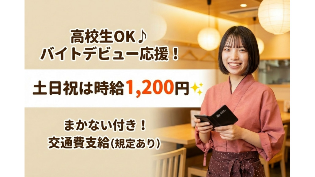 | 職種名 | 和食料理店のホールスタッフ 1日4h~OK・高級賄い無料・高校生可 |