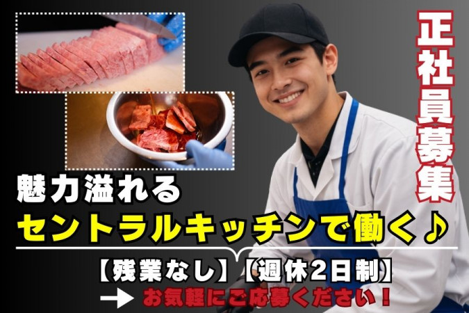 | 職種名 | セントラルキッチンの仕込み・配送業務 経験年数1年以上の方必見 食肉加工の経験を活かせる 月32万~・月8日休みで働きやすい環境 食事補助あり |
