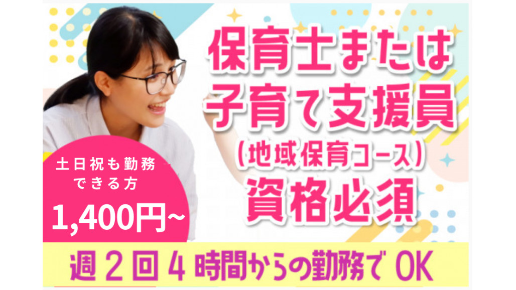 | 職種名 | 子育て見守りスタッフ 保育士、幼稚園教諭、子育て支援員 週2回1日4時間~ |