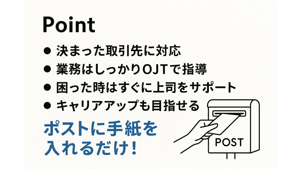 \ポスティングスタッフ大募集!/ クライアントからのご案内を、 封筒に入った「お手紙サイズ」で 各ご家庭のポストに 投函していただくお仕事です。 Wワーク中の方や、 転職先の入社待ちの方も大歓迎! 服装・髪型は自由なので、 自分らしく働けます✨ \✨このお仕事のPOINT!✨/ ✅ ノルマなし!プレッシャーゼロ 自分のペースで作業できるので、 ストレスなく続けられます。 ✅ 1人で黙々と集中できる! お客様対応は一切なし。 音楽を聴きながら、 自分のリズムで作業できます♪ ✅ シフト自由!曜日の縛りなし Wワークや副業の方も働きやすい柔軟シフト。 フルでしっかり働くのも、 週末休みにしてプライベート優先もOK! ✅ 交通費は全額支給! 通勤・移動にかかる交通費は全額当社負担。 自己負担ゼロで安心して働けます。 |