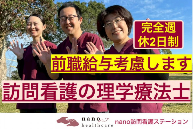 訪問リハ未経験の方歓迎!ブランクある方歓迎! 訪問看護ステーションの理学療法士募集! ■詳しい仕事内容 訪問リハビリ業務全般をお任せします。 ご利用者の希望に沿った生活ができるよう、 リハビリテーション・相談支援などを行っていただきます。 また、当社ではDX化を推進しており、報告業務は支給するiPadで行います。 いつでも・どこでも働く場所を選ばない、先進的な働き方が可能です。 ※基本ご自宅への訪問リハビリテーションになります。(交通費全額支給) ・ADLの維持・向上のリハビリテーション ・ターミナル期の方のリハビリテーション ・家族の支援・相談 など ◎当代表について 当代表は、某著名人やスポーツ選手も通院していた初台病院での勤務経験を持ち、幅広い症例への対応力と専門性を培ってきました。 病院勤務時代にはリーダーとしてチームを牽引し、理学療法士をはじめとするリハビリ専門職と密に連携しながら、チーム医療の実践を積み重ねています。 特に、看護師とリハビリ職の垣根を越えた関わりを大切にしており、当時は看護師が自主トレによるリハビリをサポートする仕組みを整えるなど、利用者様の「継続的なリハビリの実現」に尽力してきました。 現在は、その経験を訪問看護の現場に活かし、在宅でも質の高いリハビリが提供できる体制づくりを推進しています。 リハビリを本気で大切にする環境で、あなたの専門性を存分に発揮しませんか? ●nano訪問看護ステーション 『人を愛し共に歩む』 を理念に掲げ、“人”を看る訪問看護を提供しています。 病院よりも出来ることは限られているけど、 訪問看護には、訪問看護の“役割”がある。 ご利用者様が、心安らげる環境であるご自宅で、 安心して最後を迎えられるようにする環境作りが私たちの役割です。 この想いに共感してくださる方は、 是非、私たちと一緒に地域貢献していきましょう! 【PRポイント】 ・DX化を推進!場所を選ばない働き方が可能。 ・直行直帰も可、ライフサイクルに合わせて稼働できます。 ・夜勤なし/残業なし(5h以下)/賞与支給あり ・キャリアアップ・スキルアップも目指せます。 ・ブランクがある方/U・Iターンを検討している方も大歓迎 ✅ホームページやYouTubeで情報発信をしています もっと詳しく知りたい方は、「nano訪問看護ステーション」で検索してみてください。 ●お気軽にお問い合わせください。 ぜひご応募くださいね。 いきなりの面接は不安な方には施設見学も大歓迎です。 働き方の相談や、仕事内容のご質問などのお問合せもお気軽にご連絡ください。 |