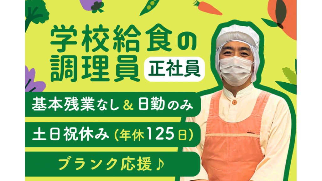 | 職種名 | 学校給食の調理員・15:15退勤 基本残業なし 土日祝休み ブランク応援 |