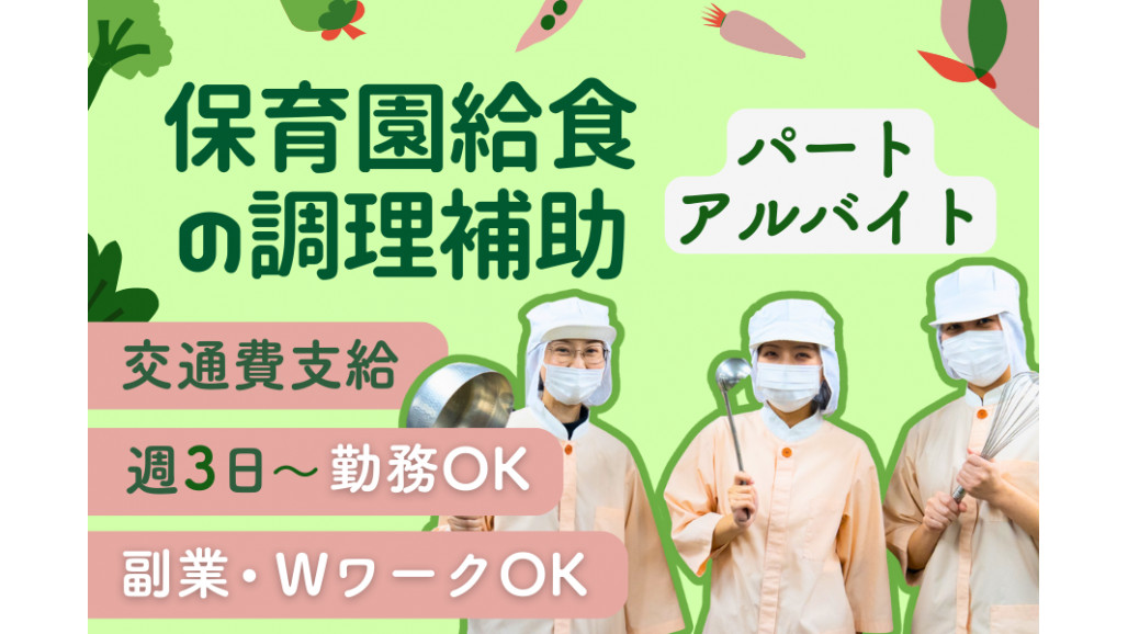【保育園給食の調理補助パート・アルバイト!】 ⭐資格・経験不問|家庭の調理経験だけでOK!⭐ \子どもたちの「おいしい♪」を支える/ 保育園の給食調理補助スタッフ(週3日〜) 【仕事内容】 新宿区立保育園での給食調理補助のお仕事です。 お任せするのは、野菜の洗浄やカット、盛り付け、食器の洗浄といった補助業務です。 調理は社員が担当するので、資格や経験がなくてもスタートしやすいお仕事です! ============== ■おすすめポイント■ ============== ✅未経験OK・年齢不問 家事経験があればすぐに活躍可能! 業務中は立ち仕事のため、初めの1ヶ月は体力的につらいかもしれません。 でも、最初はみんなでサポートするから大丈夫!大体2カ月目には体力的にも、業務的にも慣れてやりがいを感じながら働けます! ✅無理のないシフト 勤務は週3日~なので、無理のないシフト調整が可能です。 子育て中の主婦(夫)方や、子育てが落ち着いた中高年やシニアの方にもピッタリ! ✅働くママ(パパ)応援! 毎年昇給の実績あり。頑張りがしっかりとお給料に反映される環境です! また、お子様の急な休みや授業参観など、柔軟に対応しております。 ✅無料観戦ツアー NECグループのバレーボールチームの試合観戦が可能です。 年1回の特別観戦は本人と同伴最大3名の計4名まで参加OK(お弁当付き) 通常の観戦時は本人と同伴1名の計2名まで参加可能で、年間10回前後の観戦機会があります。 お子様やご家族と一緒に楽しめる福利厚生です♪ ============== 【主な一日の流れ(例)】 ・09:00~ 業務開始(食器準備や野菜のカット) ・09:30~ 午前のおやつ(牛乳)の提供 ・10:00~ 調理補助(野菜の絞り、調味料の計量、肉団子の成型など) ・10:30~ 盛り付け(年齢に合わせて1人ひとりに盛り付け) ・11:30~ 片付け ・12:00~ 休憩(1時間) ・13:00~ 洗浄作業・おやつ作成 ・14:00~ おやつ盛り付け・片付け ■スタッフの声 「自宅でのお料理のレパートリーが増えました!」 「細かく指示を出してくれるのですぐに仕事を覚えられ、少しずつ自信がついていくのが実感できます!」 「子どもたちが給食の時間を楽しみにしていて、"今日の給食も美味しい!"と声をかけてくれるのが何よりのやりがいです」 一度話を聞いてみたい…など、 当社の保育園給食の調理補助に少しでも興味を持たれましたら、ぜひ一度ご応募ください! |