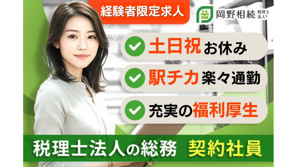 「相続税」に特化した税理士法人として、全国で多くのお客様をサポートしている当法人。 更なる業務拡大にむけて、総務スタッフ(契約社員)を新たに募集いたします。 ■PRポイント 土日祝休みで長時間の残業はないのでワークライフバランスを重視したい方におすすめです。 ✅年間休日122日 ✅駅から徒歩2分の好立地 ✅長時間の残業やみなし残業なし 【こんな方にオススメです!】 ✅土日祝日はしっかり休みたい方 ✅総務での勤務経験を活かしたい方 ✅PCスキルを活かして働きたい方 【仕事内容】 当法人の総務スタッフは、各部署の業務を支えるため幅広いサポートを担っています。 <具体的には…> ・届いた請求書の管理 ┗エクセルで取り纏めて、担当者へチェック依頼。承認が下りれば経理に支払い依頼 ・レターパック・収入印紙等の管理 ┗郵便は料金後納の為、切手は不要 ・小口現金(10万円程)や・クオカード等金券の管理、支払業務 ・全事務所の士業の年会費支払い管理 ・お中元・お歳暮の管理 ・全事務所のビル管理及びビル関係の連絡業務 ・レンタカー、ETCカード、車の管理 ・備品管理 ・支店の会議室予約 ・入退社やパート職員のシフト管理 ・社用パスモの管理 ・名刺の発注、作成 ・研修申込 ・お弁当の手配 ・代表からの依頼で書類作成、買い物、雑務 適性に合わせて少しずつ業務をお任せしていきます。 ■職場の雰囲気 現在20~40代の女性スタッフが活躍中!スタッフ同士も仲が良く、お互い助け合いながら業務にあたっています。 基本的に定時になったら帰るのが当社の風潮です。仕事もプライベートも充実できるのが当社の魅力です! =============== ✅人を支える仕事です =============== 総務スタッフは、各部署がスムーズに業務を進められるよう、社内全体を支える大切なポジション。 請求書の管理や備品管理、支店の会議室予約など、幅広い業務を少しずつお任せしていきます。 先輩が丁寧にフォローしますので、ブランクがある方も安心して始められます。 「人を支える仕事が好き」「長く安心して働ける環境を探している」――そんな方にぴったりです。 =============== ✅岡野相続税理士法人について =============== 2005年の創業以来「お客様の役に立ちたい」をモットーに、全国各地、お客様の相続税に関するお悩みを解決してまいりました。 今では「相続税専門の税理士法人」として、本社のある新横浜の他、東京、新宿、立川に拠点を構えるまでに成長いたしました。 土地評価額を下げることを強みに、196億円(2,966件/令和7年9月末時点)もの相続税還付に成功してきた実績があります。 【求人ID-SOM01】 |