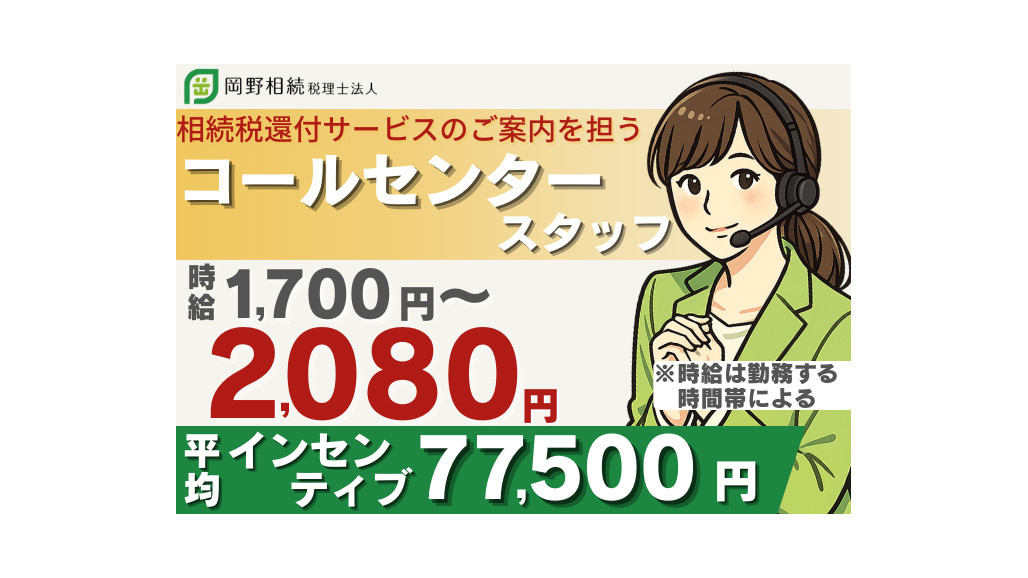 当法人は相続税に関する案件を専門に扱い、多くのお客様からのご依頼に向き合って参りました。 スクリプト通りにご案内し、興味を持っていただいたお客様のアポイントを取るなお仕事です。 相続税や税務に関する知識がなくても、丁寧な研修で現場デビューをバックアップいたします。 【PRポイント】 ✅高水準の時給とインセンティブ! インセンティブの月平均は77,500円 → 頑張った分だけしっかり収入UP! ✅努力が収入に直結するので、やりがいアップ! 勤続平均 4年(最長 10年 のスタッフも!) → 明確な評価制度でモチベーション維持◎ ✅ライフスタイルに合わせて働ける 週3日〜、1日4時間〜OK、曜日自由 → 「午前・午後だけ」「送り迎えの合間」も可 主婦(夫)さん・子育て中のスタッフ多数活躍中 ■仕事内容 相続税を申告されたお客様にお電話し、税金の過払い確認とサービスのご案内をします。 ・スクリプト通りに案内すればOK ・相続知識は不要・専門質問はコンサルタントへ ■仕事の流れ 1.用意されたリストに沿って一般家庭へ架電 2.当社の相続税還付サービスをご案内 3.アポイントを取得し無料相談の日程を調整 4.お客様情報を用紙やシステムへ入力 ※以降は専門チームへ引き継ぎ! お任せするのは面談設定までで、お客様へのアフターフォローは担当者が対応いたします。 ===================== ✨成果が収入に反映、働く満足度◎ ===================== 頑張りが収入に直結するインセンティブ制度が魅力。相続や税務の知識がなくても、月7〜10万円の収入アップを目指せる環境が整っています。 時給は時間帯ごとに細かく設定されており、最大時給2,080円も可能。固定給+インセンティブで、効率よくしっかり稼げます。 お任せするのはお客様へのご案内とアポイント取得まで。専門的な説明や難しい対応は専門チームが担当するため、未経験の方でも安心して取り組めます。 マニュアル完備・トークスクリプトありで、話す内容や流れも明確。コールセンター業務が初めてでも、成果を出しやすく、評価されやすい環境です。 ===================== ✨岡野相続税理士法人について ===================== 2005年創業の「相続税専門の税理士法人」。新横浜・東京・新宿に拠点を持ち、全国対応を実現しています。 相続税の還付成功 195億円(2,960件/令和7年8月時点)土地評価額の見直しに強く、多くのご家庭の税負担を軽減! 今後も全国展開を予定しており、安定基盤+成長性のある企業です。 収入も働き方も大切にしたい方、効率よく稼ぎたい方からのご応募をお待ちしています。 【求人ID-TEL01】 |