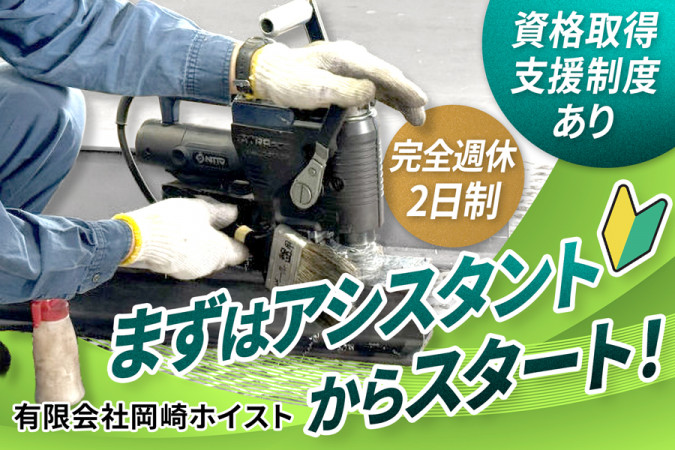 産業インフラを支える高い技術力で、大手企業からも厚い信頼を得ている「岡崎ホイスト」。 法定点検を含む安定した需要があり、「景気に左右されにくい」という強みを持ちます。次代のものづくりを担う新スタッフを募集します。 \まずはアシスタントとしてスタート!/ 最初の1年ほどは先輩スタッフがそばに付き、業務の流れや知識を丁寧に教えます。未経験の方でも安心して着実に成長できる環境です。 【当社のオススメPoint】 ・年間休日120日以上! ・さまざまな資格や免許を取得可 ・スキルUPに応じて昇給や賞与での評価あり ■具体的なお仕事内容 私たちの仕事は、工場で使われる「天井クレーン」の骨組みをつくること。鉄の部品を溶接でつなぎ、図面通りに形を整えていきます。 ・図面を見ながら部品をチェック ・鉄を仮どめして、専用機械で溶接 ・表面を整えて、仕上がりを確認 クレーンがなければ、工場は動かない。 工場が動かなければ、社会は止まる。 そんな、私たちの暮らしを支えている大型設備を、手作業で丁寧に仕上げていく仕事です。 ===================== 私たちの技術が、日本の工場を動かしている ===================== 自動車、電気、機械、化学── あらゆるモノづくりの現場で「天井クレーン」は欠かせない存在です。私たちはそのクレーンをつくり、命を吹き込む大事な仕事を担っています。 図面を読み、溶接し、仕上げる。一見地味に思えるかもしれませんが、その一つひとつの工程が、多くの工場の安全と生産を支えています。 見えないところで、確実に社会を動かす。それが、岡崎ホイストの技術者たちの誇りです。 ===================== 10年先もここで働いていたいと思える環境を ===================== 未経験からスタートした社員が、安心して成長し、長く活躍しています。その理由は、丁寧な教育体制と、納得の収入、そして充実の福利厚生。 ・完全週休二日制 長期連休制度もあり ・昇給や賞与、福利厚生も業界トップクラス ・勤務年数や技術力アップに応じた昇給制度あり 着実に技術を身につけ、将来を見据えて働ける職場をお探しの方に、ぴったりの環境です。 ================== 家族や友人にも自慢できる会社です! ================== 「転職して、たくさんの資格が取れました」 「休日も多く、家族や友人にも自慢できます」 「やっと、誇れる会社に出会えました!」 こうした声が、当社では当たり前のように聞こえてきます。未経験からでも確かな技術を身につけられるよう、資格取得も全面的に支援します。 頑張る人、まじめな人、意欲的な人をきちんと評価し、安心して長く働ける環境を整えています。 「いい会社に出会えた」 ――その実感を、あなたにも。 【求人ID-SKK】 |