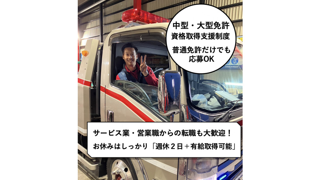 【人びとの心に寄り添う仕事。】 私たちの仕事はお客様の心に寄り添う仕事。時には涙を流して喜ばれることも。レッカーサービスを通じて人びとを助けていきませんか。 ■必須条件 ・自動車整備士2級以上 ・整備士としての実務経験(年数不問) ・普通自動車免許または中型自動車免許 ※平成19年6月以降に、普通自動車免許を取得した方は中型免許が必要ですが、入社後、取得支援制度がありますので、お気軽にご応募ください。 ■優遇条件 ・大型自動車免許 ・玉掛け作業主任者資格 ・クレーン操作者の資格 【当社の想い】 自動車の整備・メンテナンスの技術・経験はもちろん必要ですが、当社が何より大切にしているのは「お人柄」です。 この仕事は本当に困っている人を助ける仕事です。人助けへの情熱を持ち、一緒に働く仲間を心から大事にできる人を採用したいと思っています。 |