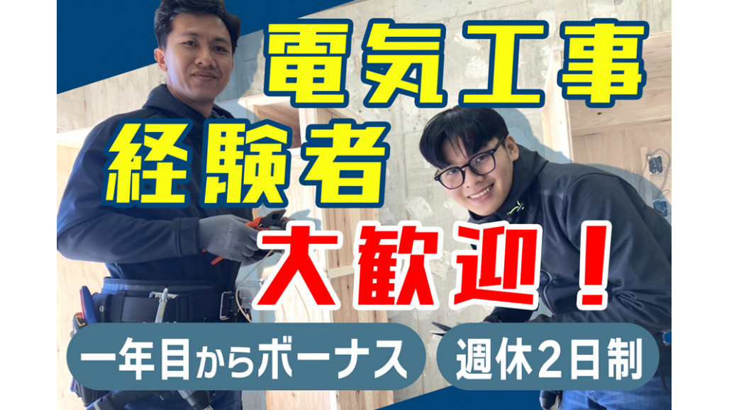 | 職種名 | 電気工事士(分譲住宅の電気工事) 経験者 週休2日制 長期連休あり |