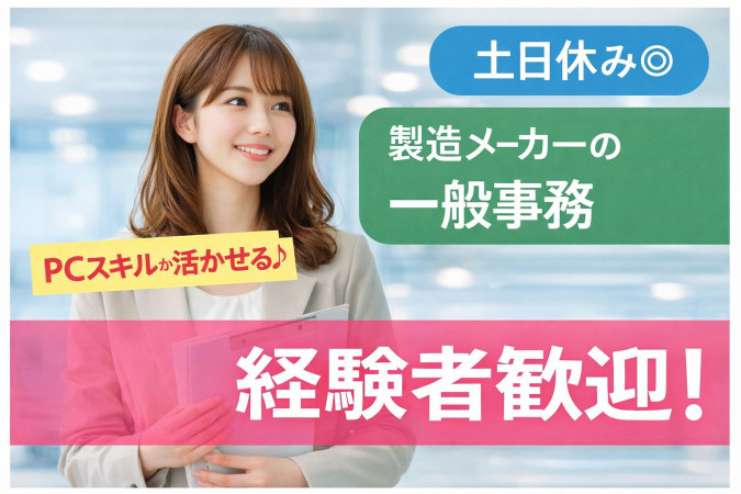 | 職種名 | 製造メーカーの一般事務 経験者優遇 土日休み 経験を活かせる 長期休暇あり 資格不問 ブランク可 |