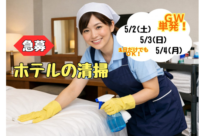5/2(土)・5/3(日)・5/4(月) 10時~14時、GW限定のホテルの客室清掃スタッフを募集いたします。 宿泊施設での清掃経験がある方はもちろん、オフィスビルや商業施設、学校、病院などの清掃スタッフとして勤務されていた方もぜひご連絡ください! レジャー施設・アミューズメント施設・マンションの共用部などの清掃経験をお持ちの方も、即戦力としてご活躍いただけます。 ハウスクリーニングや家政婦(夫)、家事代行のご経験のある方、興味のある方もご検討いただけたら嬉しいです。 学生さんもOKです!Wワーカーさんや副業、本業との掛け持ちをされている方もご応募ください! ピッキングや梱包作業、検査・検品といったモクモクとできる工場内作業、ルーティンワークをしてこられた方にもおすすめです。 「清掃の仕事をしたい」「ホテルで働いてみたい」「単発の仕事を探している」という方からのご応募をお待ちしています! |
