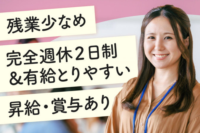 8:30~17:30(休憩60分) (所定労働時間8時間/休憩時間1時間) 総労働時間:160時間/月 【残業について】 残業は1ヵ月あたり15時間未満です。 1日1~2時間程度の残業をお願いする場合もございますが、長時間に渡るような残業は一切ありません。 プライベートの時間をきちんと確保しながら、ムリなく働けますよ。 |
