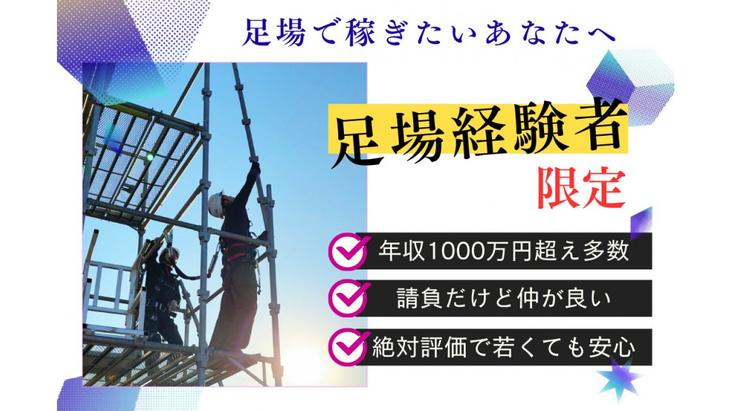 | 職種名 | 足場スタッフ 鳶経験者限定・自己都合シフトOK 月80~200万稼げる |